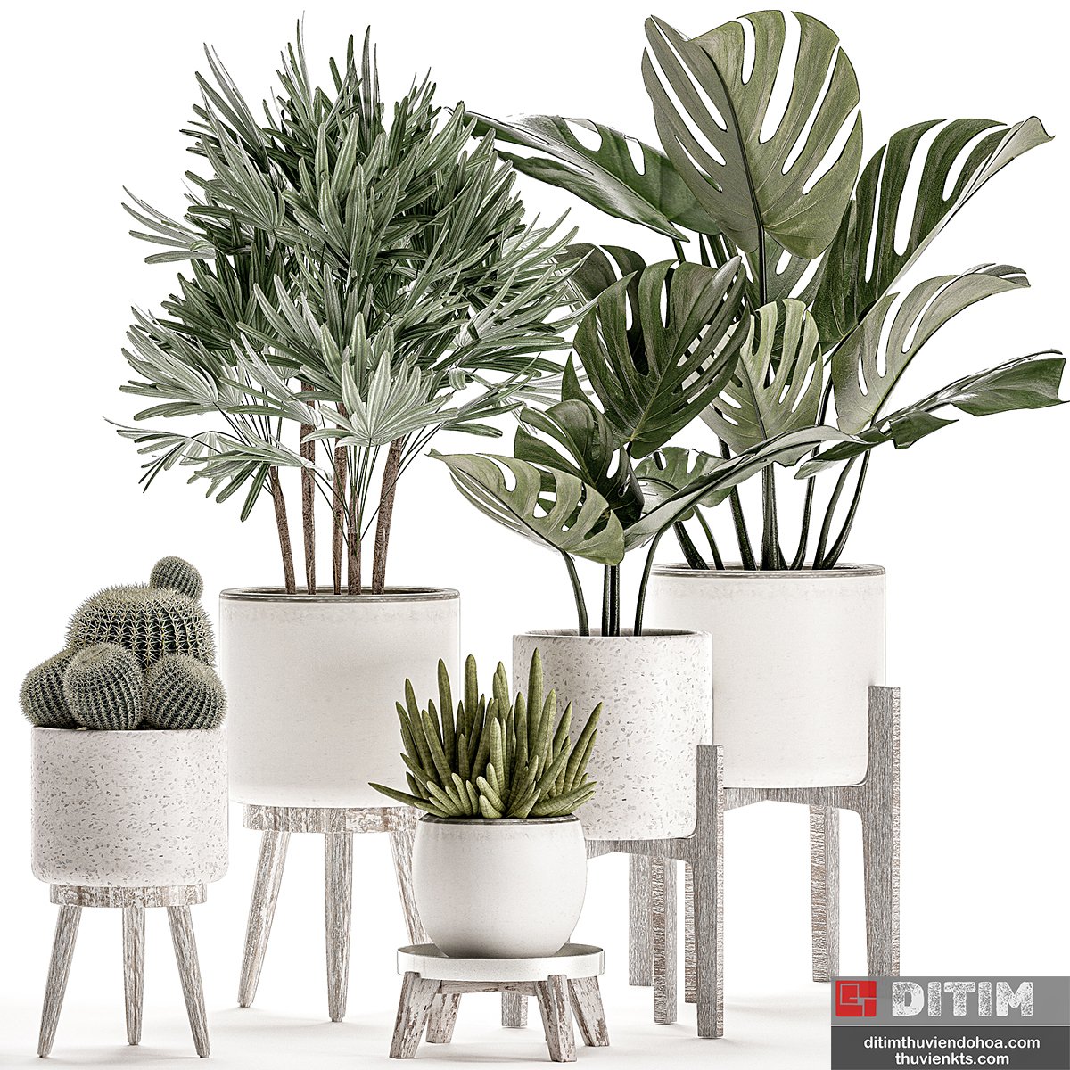 Collection of small plants in white pots on legs with monstera, raspis, palm, cactus, Barrel cactus. Set 509.